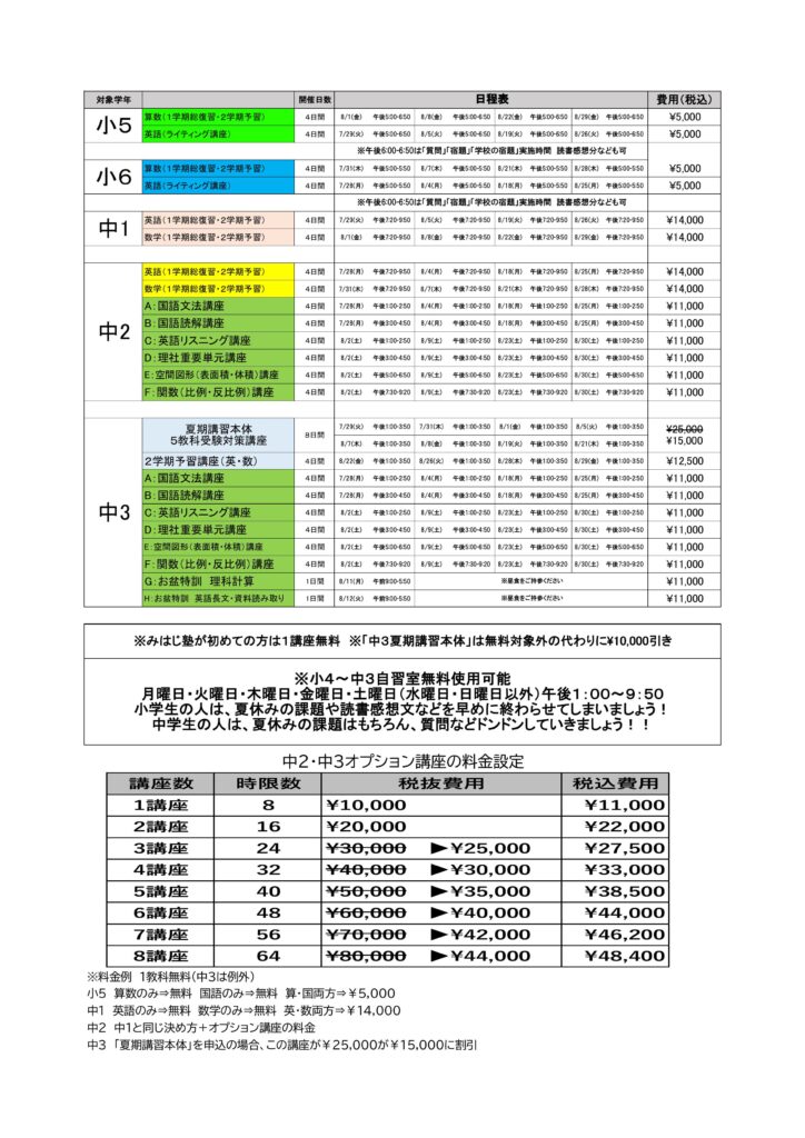 お盆前は【1学期の重要単元復習(式の計算・連立方程式文章題】、お盆後は【2学期の予習(英:不定詞・動名詞 数:一次関数)】(※学校の進度により変更する可能性あり) 1教科無料(みはじ塾が初めての方対象)