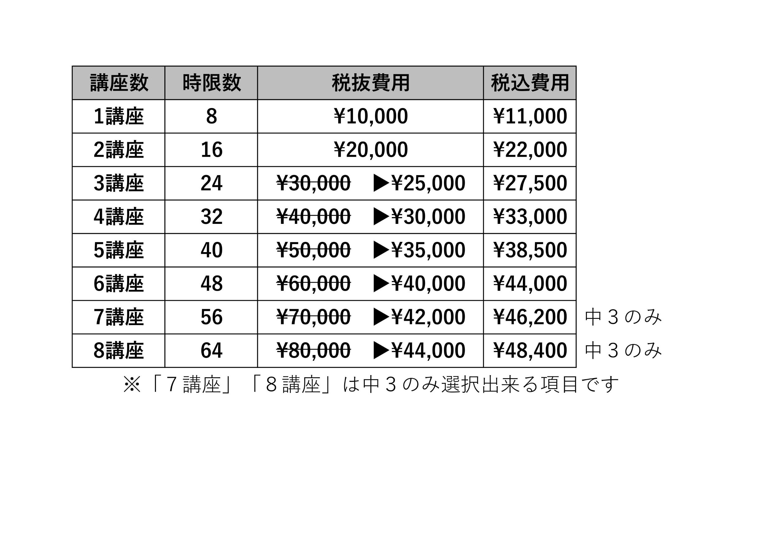 全8種の講座からカスタマイズ可能。全てが入試に重要な単元です。多くの講座を受講しやすくするため、講座数が多くなるほど割引がかかる形式にしております。