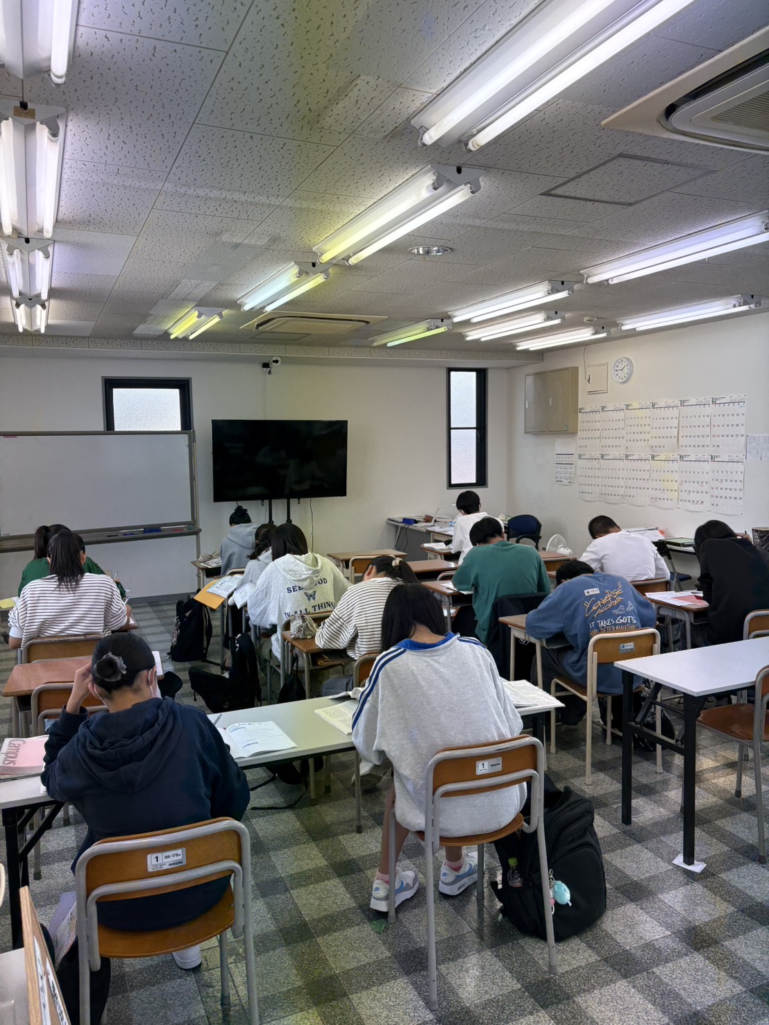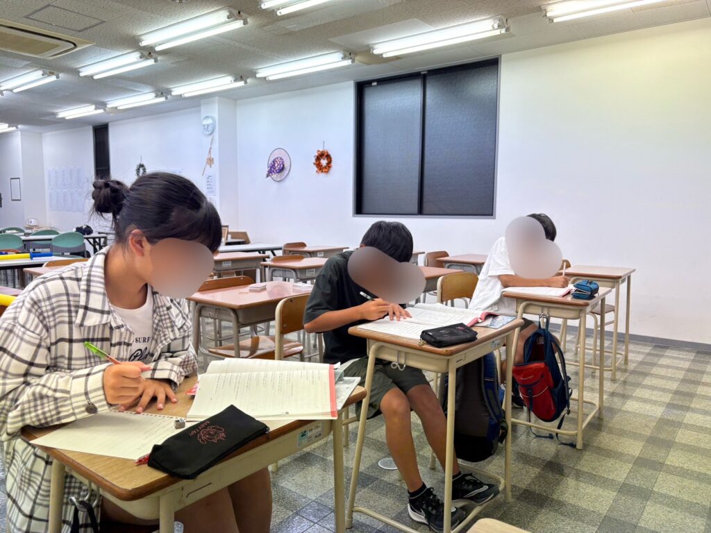 ■英語:毎週月曜日の午後5:00~5:50授業、その後~6:50まで自習・演習(※途中で用事がある人は帰宅可)
