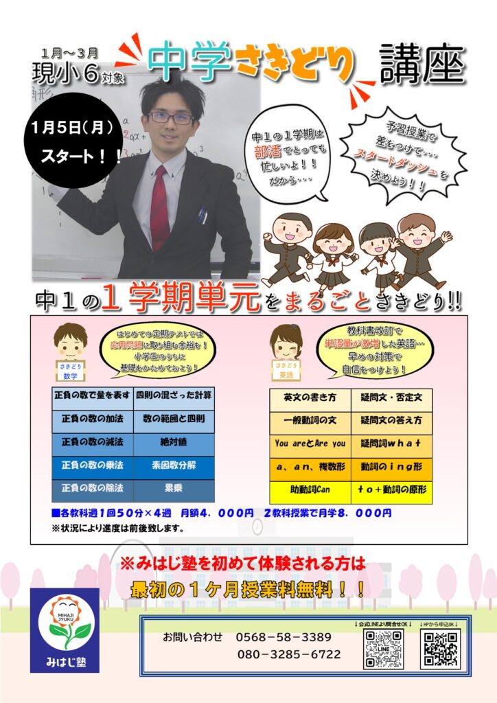 そこで勉強面での不安を無くし、中学校生活を有意義にするため「みはじ塾」では、1月2月3月の3か月間、英語と数学の2教科で【中学校の内容の先取り予習】を実施していきたいと思います!