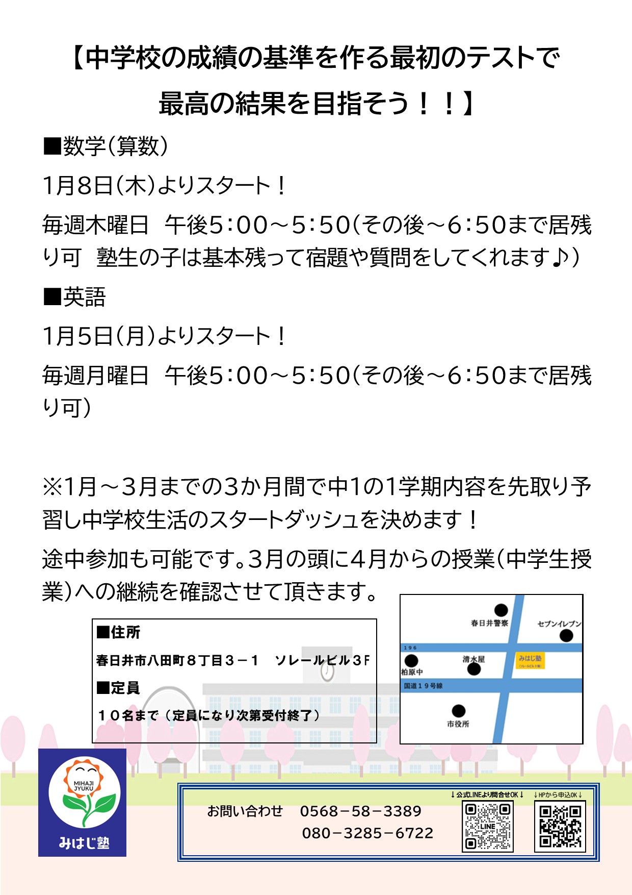 そこで勉強面での不安を無くし、中学校生活を有意義にするため「みはじ塾」では、1月2月3月の3か月間、英語と数学の2教科で【中学校の内容の先取り予習】を実施していきたいと思います!