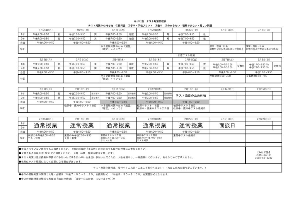 ※塾生の方は、当日までにテスト範囲になるであろう学校のワークを全て終えた状態で対策を開始します。ある程度学校のワークを進めておいて頂けると成績がより上がりやすいです。
